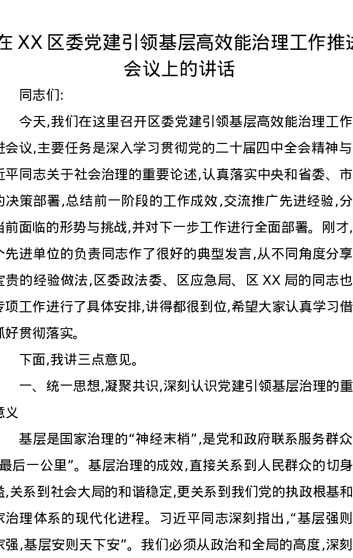 在XX区委党建引领基层高效能治理工作推进会议上的讲话