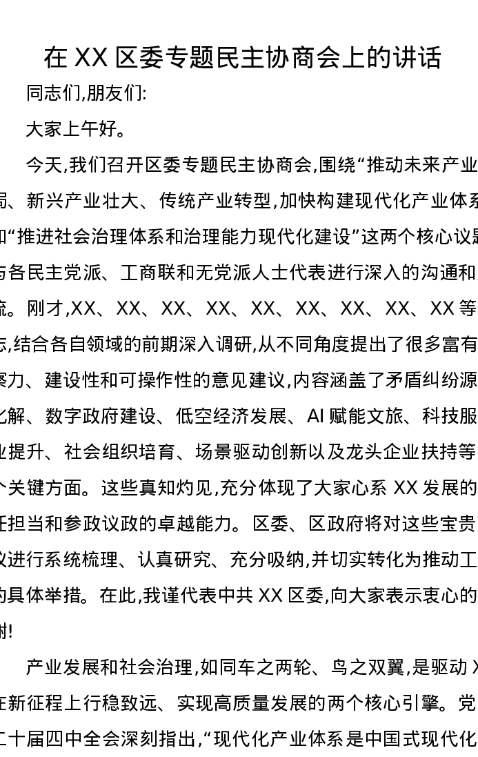 在XX区委专题民主协商会上的讲话