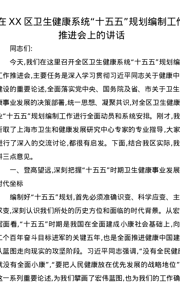 在XX区卫生健康系统十五五规划编制工作推进会上的讲话2