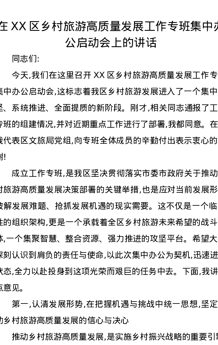 在XX区乡村旅游高质量发展工作专班集中办公启动会上的讲话