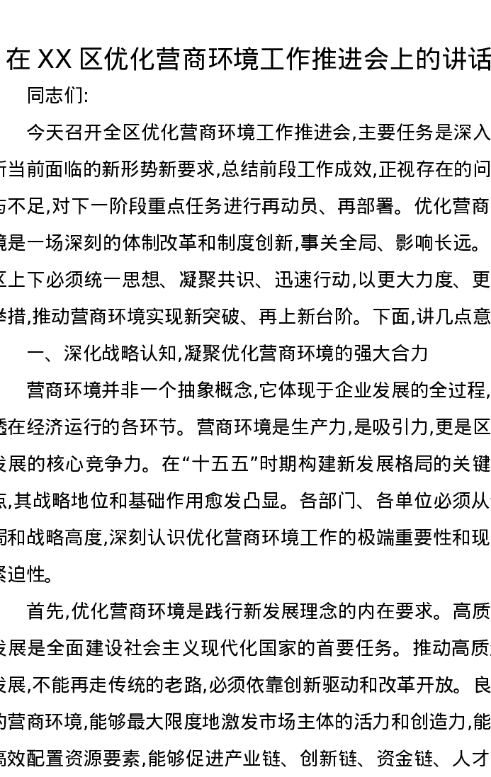 在XX区优化营商环境工作推进会上的讲话
