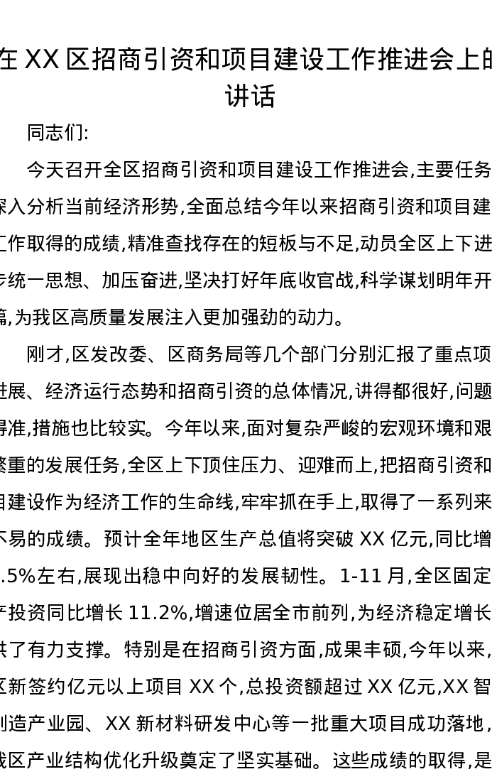 在XX区招商引资和项目建设工作推进会上的讲话