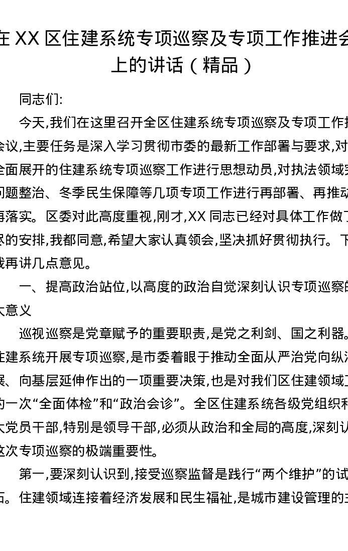 在XX区住建系统专项巡察及专项工作推进会议上的讲话