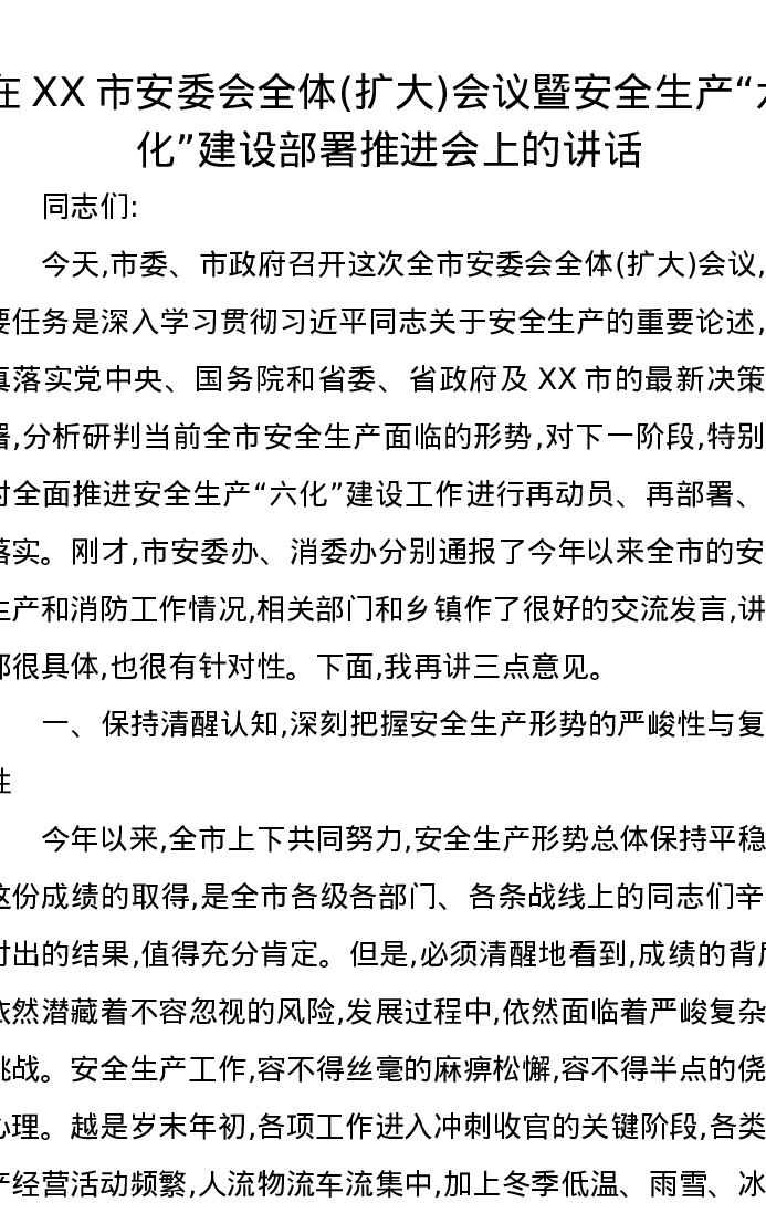 在XX市安委会全体(扩大)会议暨安全生产六化建设部署推进会上的讲话2