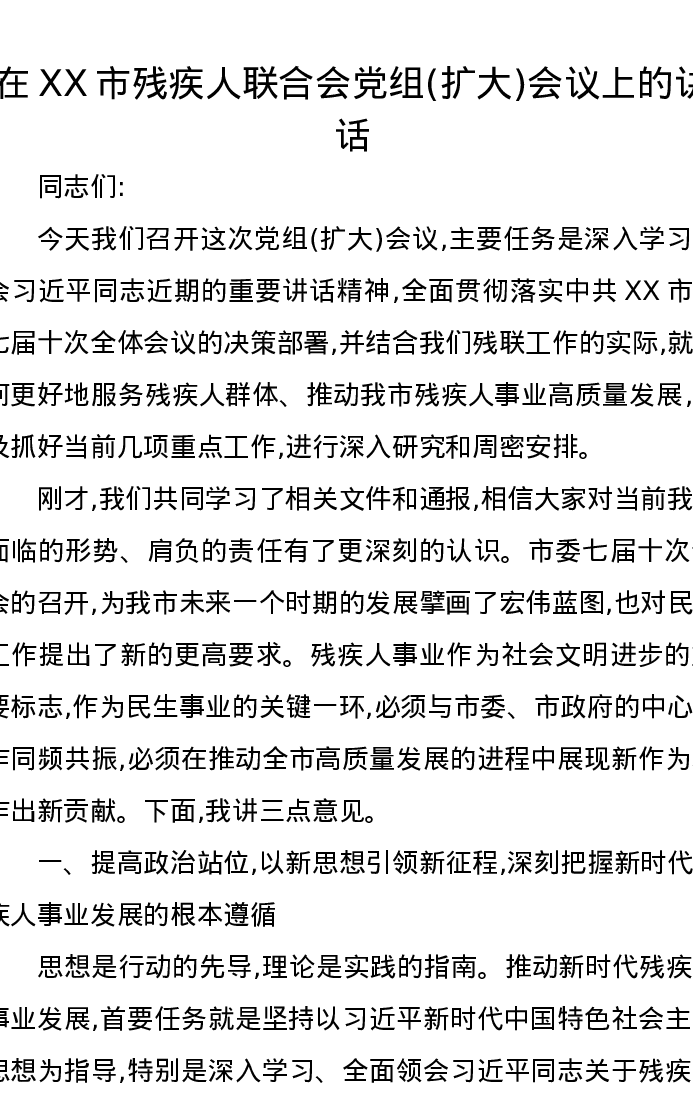 在XX市残疾人联合会党组(扩大)会议上的讲话