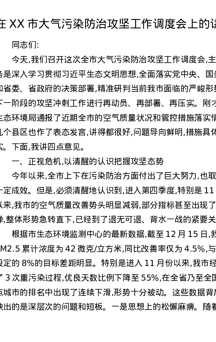 在XX市大气污染防治攻坚工作调度会上的讲话
