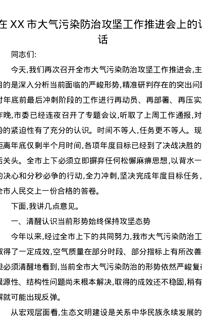 在XX市大气污染防治攻坚工作推进会上的讲话
