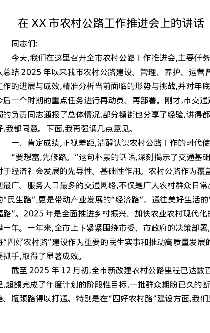 在XX市农村公路工作推进会上的讲话