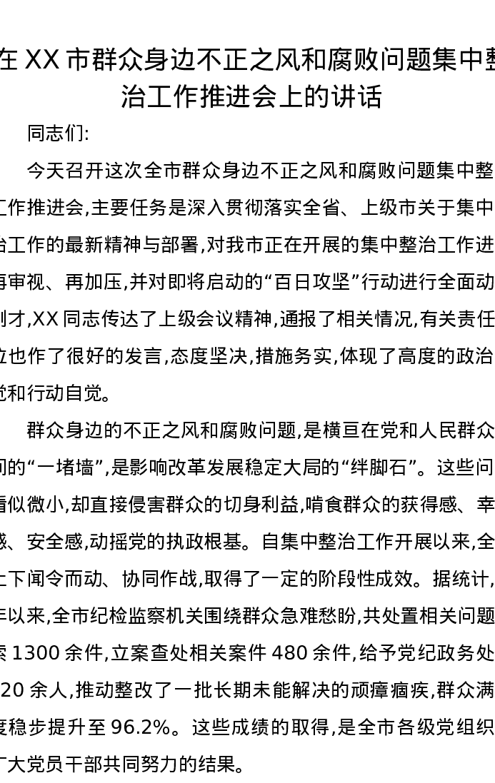 在XX市群众身边不正之风和腐败问题集中整治工作推进会上的讲话2