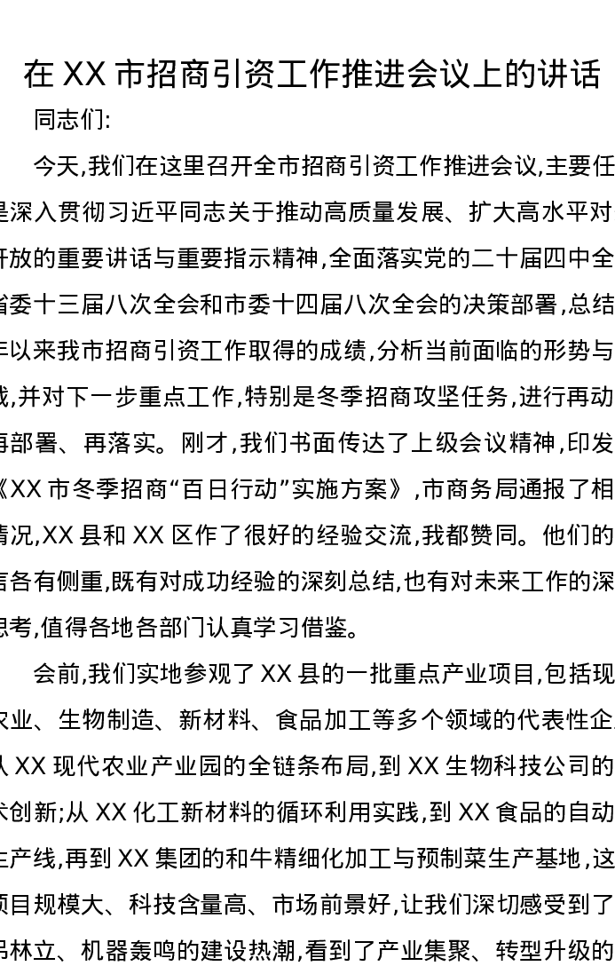 在XX市招商引资工作推进会议上的讲话