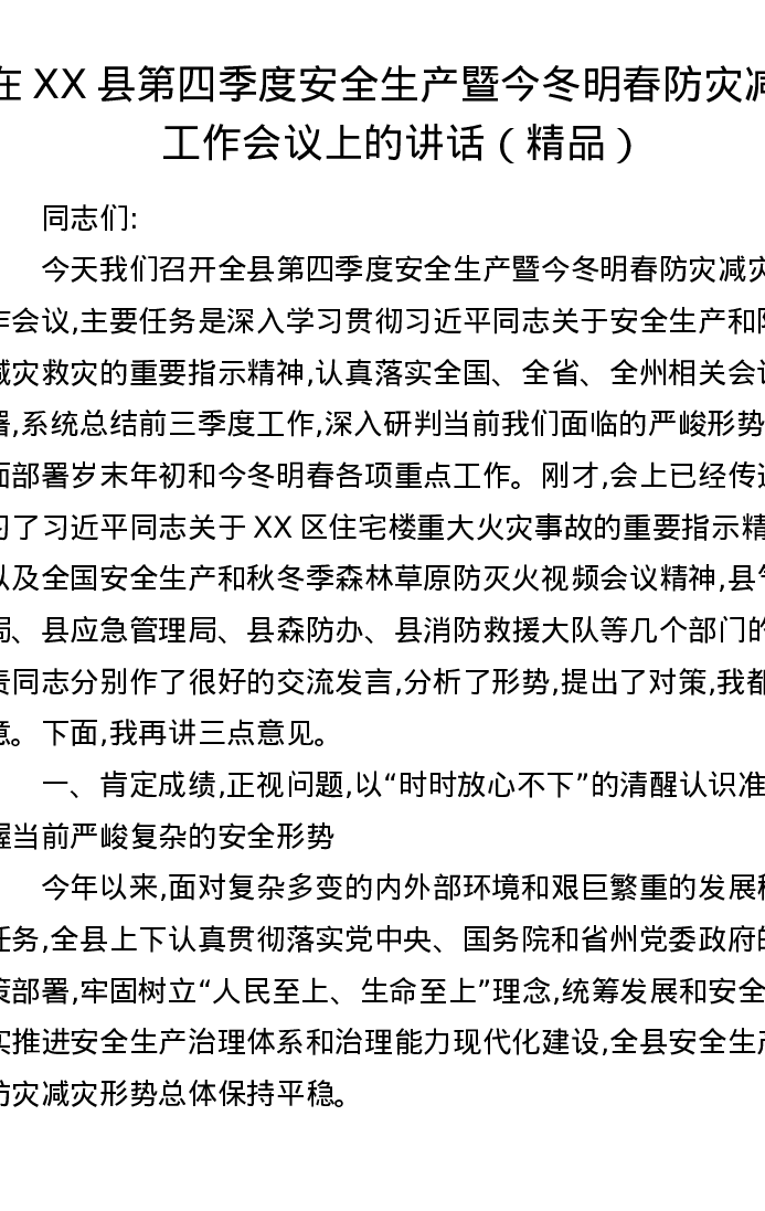 在XX县第四季度安全生产暨今冬明春防灾减灾工作会议上的讲话
