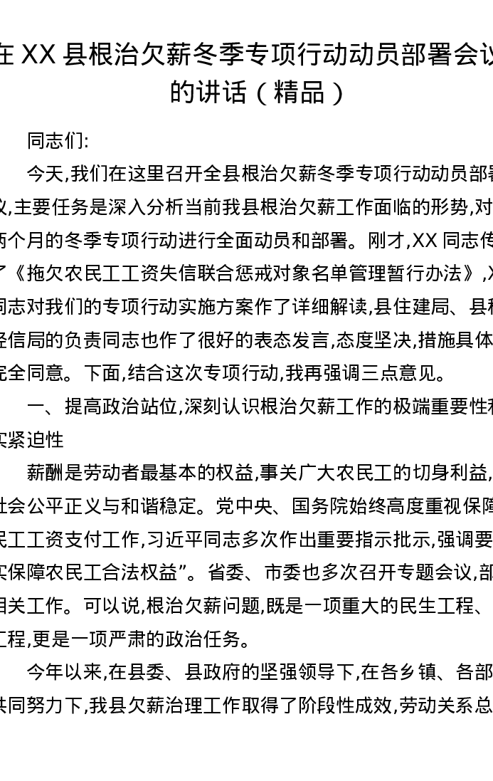 在XX县根治欠薪冬季专项行动动员部署会议上的讲话