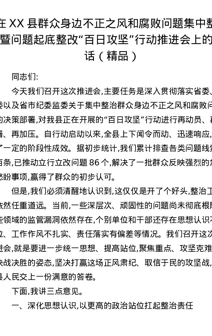 在XX县群众身边不正之风和腐败问题集中整治暨问题起底整改百日攻坚行动推进会上的讲话