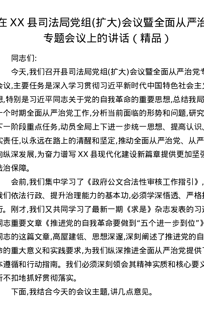 在XX县司法局党组(扩大)会议暨全面从严治党专题会议上的讲话