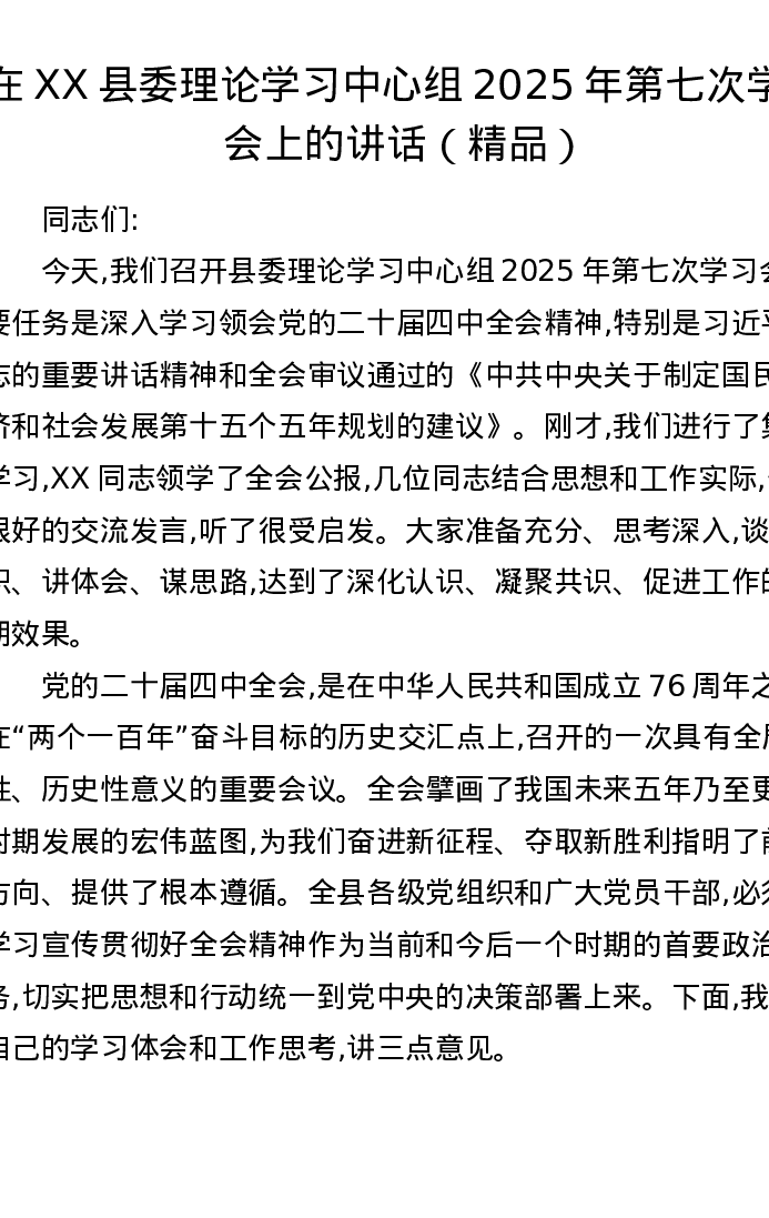 在XX县委理论学习中心组2025年第七次学习会上的讲话