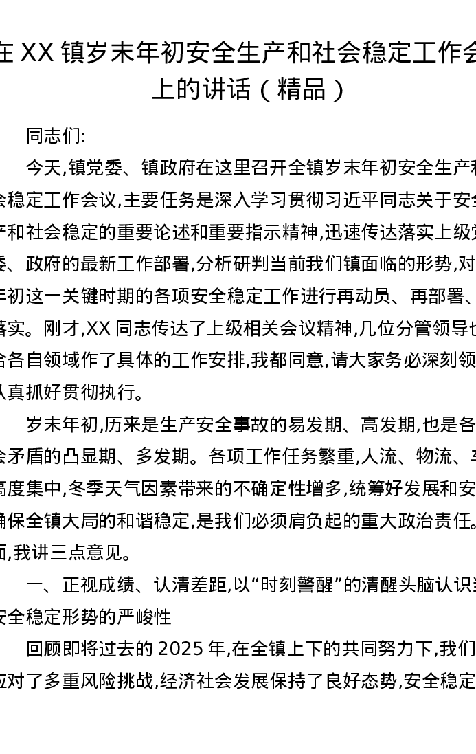 在XX镇岁末年初安全生产和社会稳定工作会议上的讲话