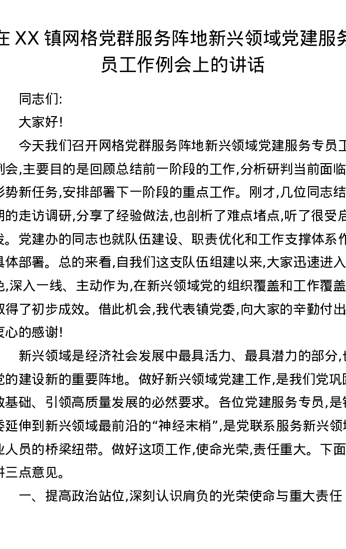 在XX镇网格党群服务阵地新兴领域党建服务专员工作例会上的讲话