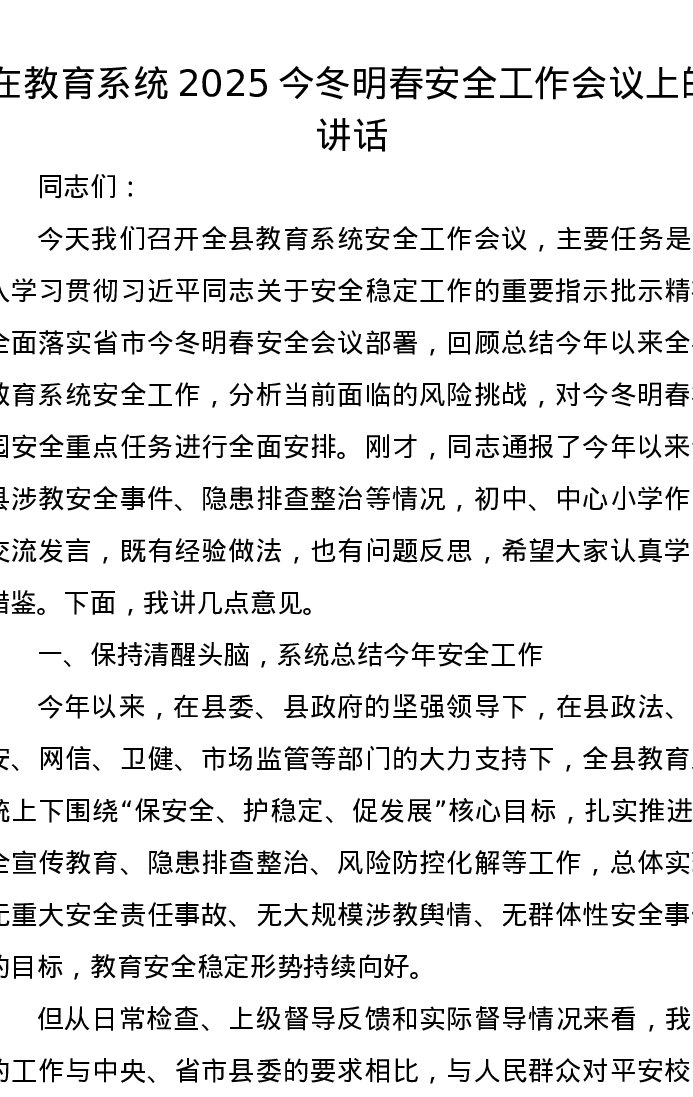 在教育系统2025今冬明春安全工作会议上的讲话