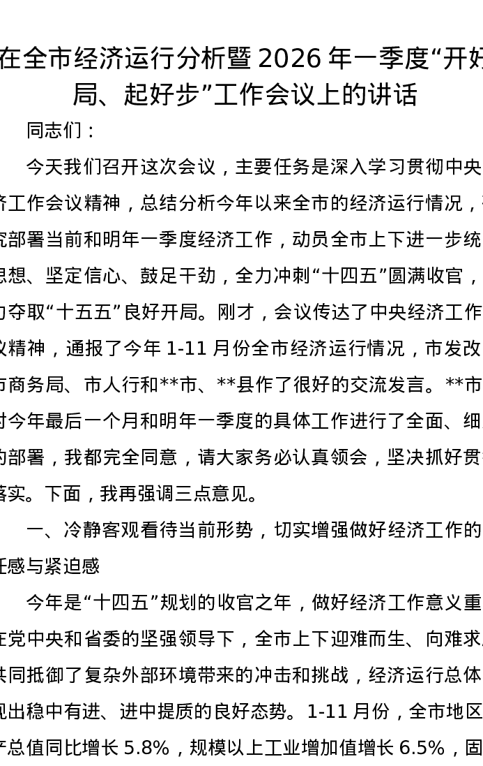 在全市经济运行分析暨2026年一季度开好局、起好步工作会议上的讲话