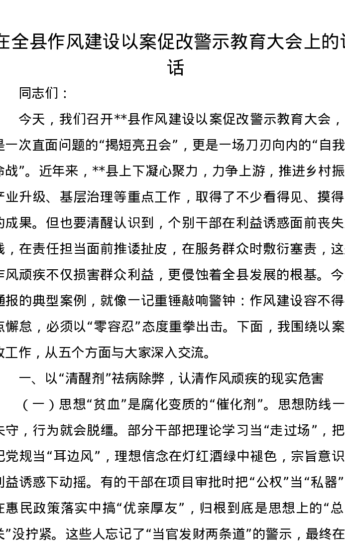 在全县作风建设以案促改警示教育大会上的讲话