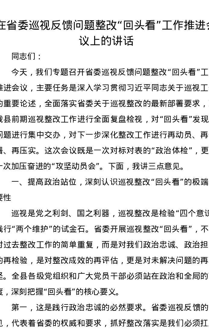 在省委巡视反馈问题整改回头看工作推进会议上的讲话