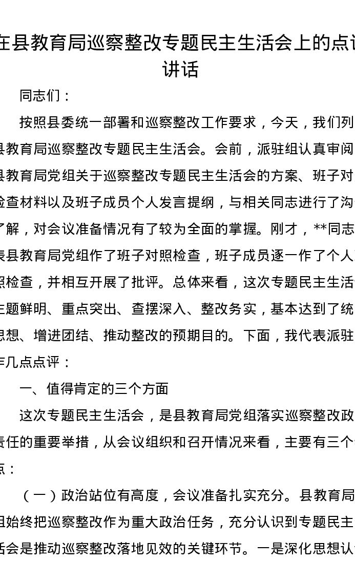 在县教育局巡察整改专题xxxxx上的点评讲话