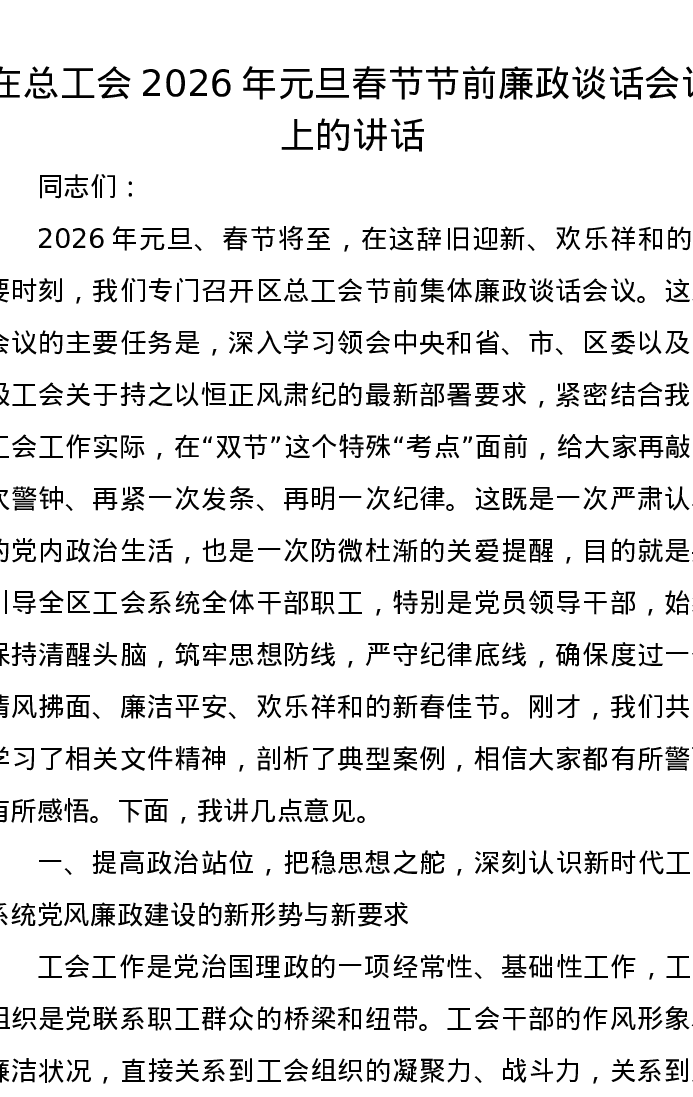 在总工会2026年元旦春节节前廉政谈话会议上的讲话