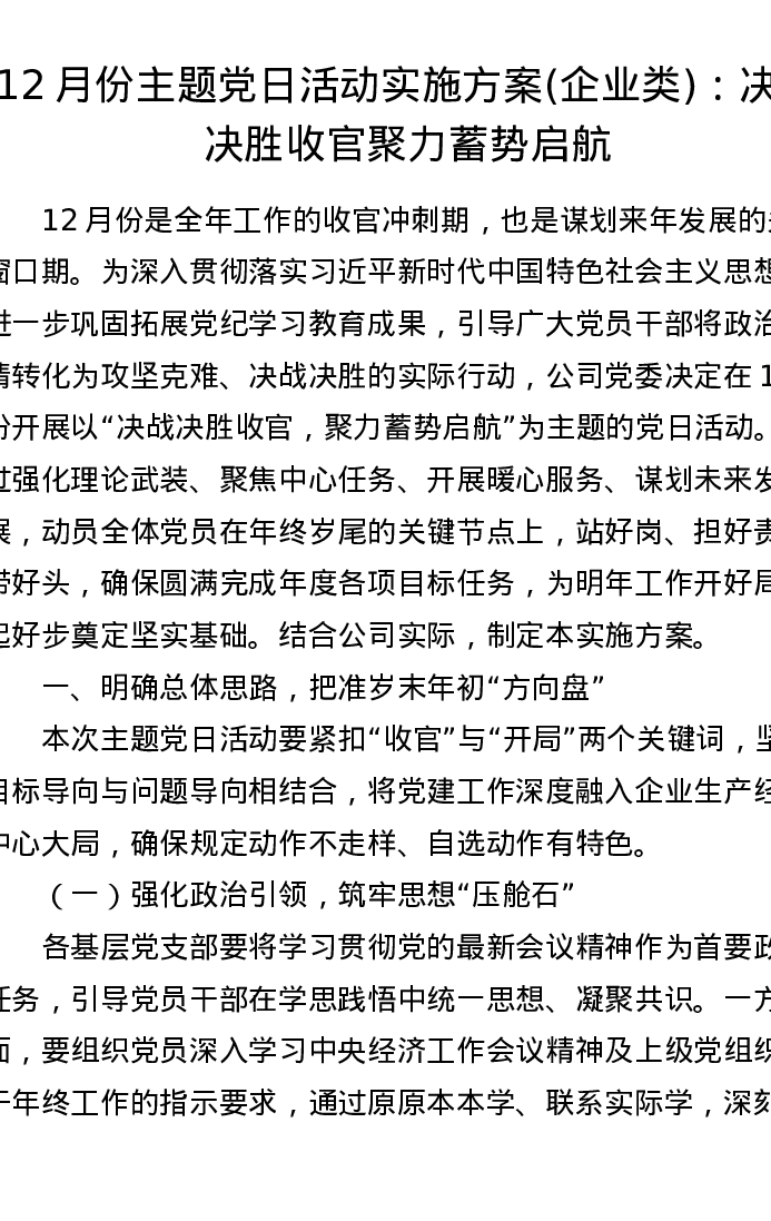 12月份主题党日活动实施方案(企业类):决战决胜收官 聚力蓄势启航