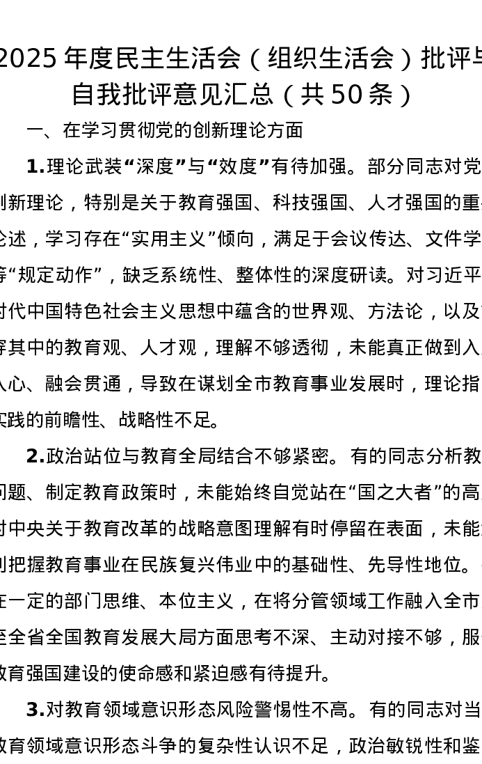 2025年度xxxxx(组织xxx)批评与自我批评意见汇总(共50条)