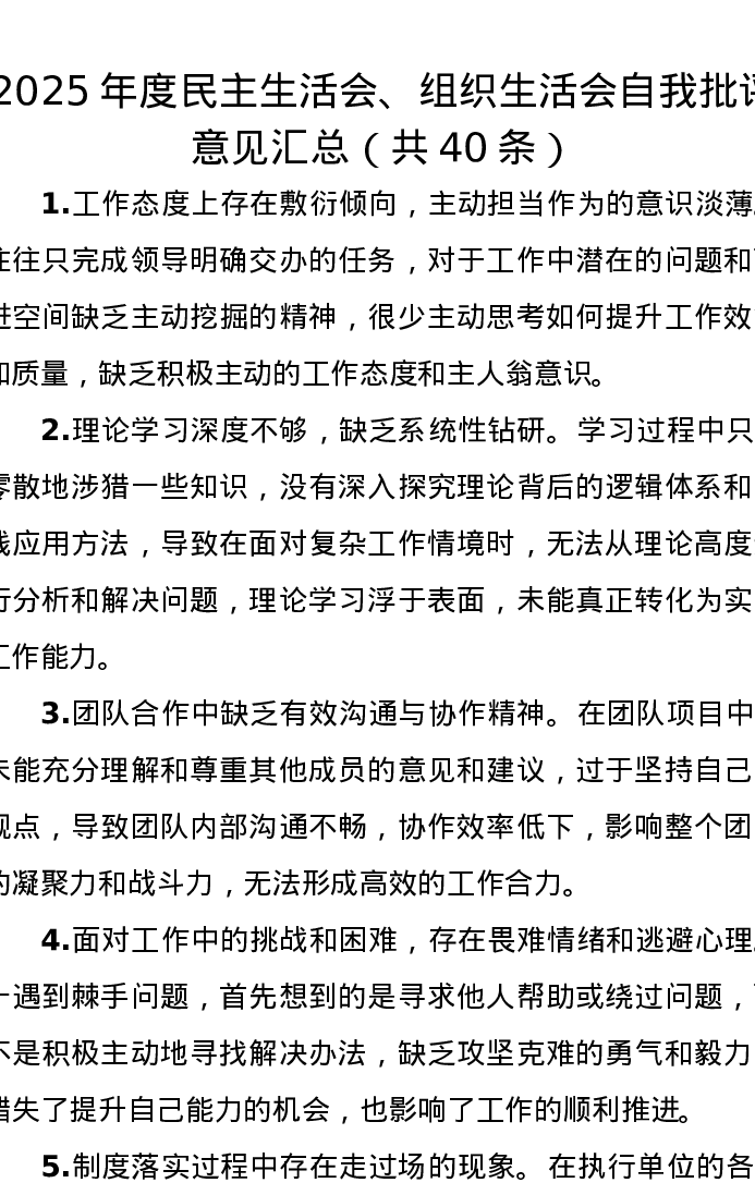 2025年度xxxxx、组织xxx自我批评意见汇总(共40条)