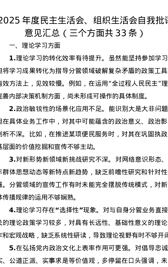2025年度xxxxx、组织xxx自我批评意见汇总(三个方面共33条)