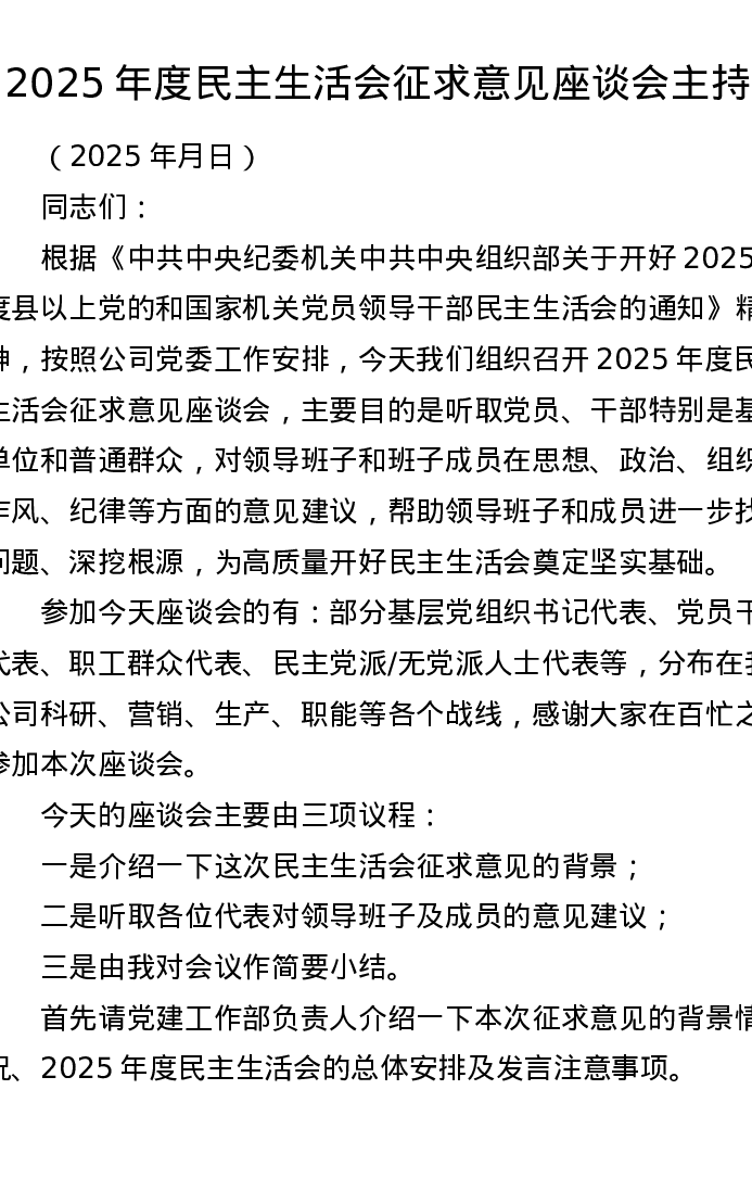 2025年度xxxxx征求意见座谈会主持词(五个带头)