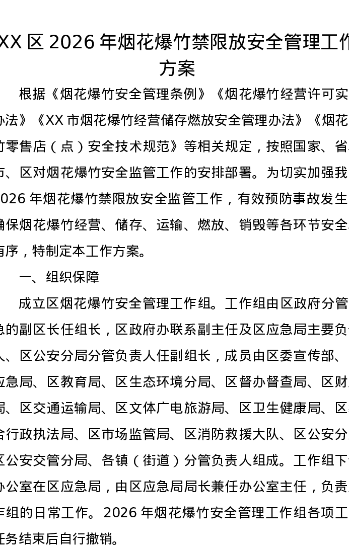 XX区2026年烟花爆竹禁限放安全管理工作方案