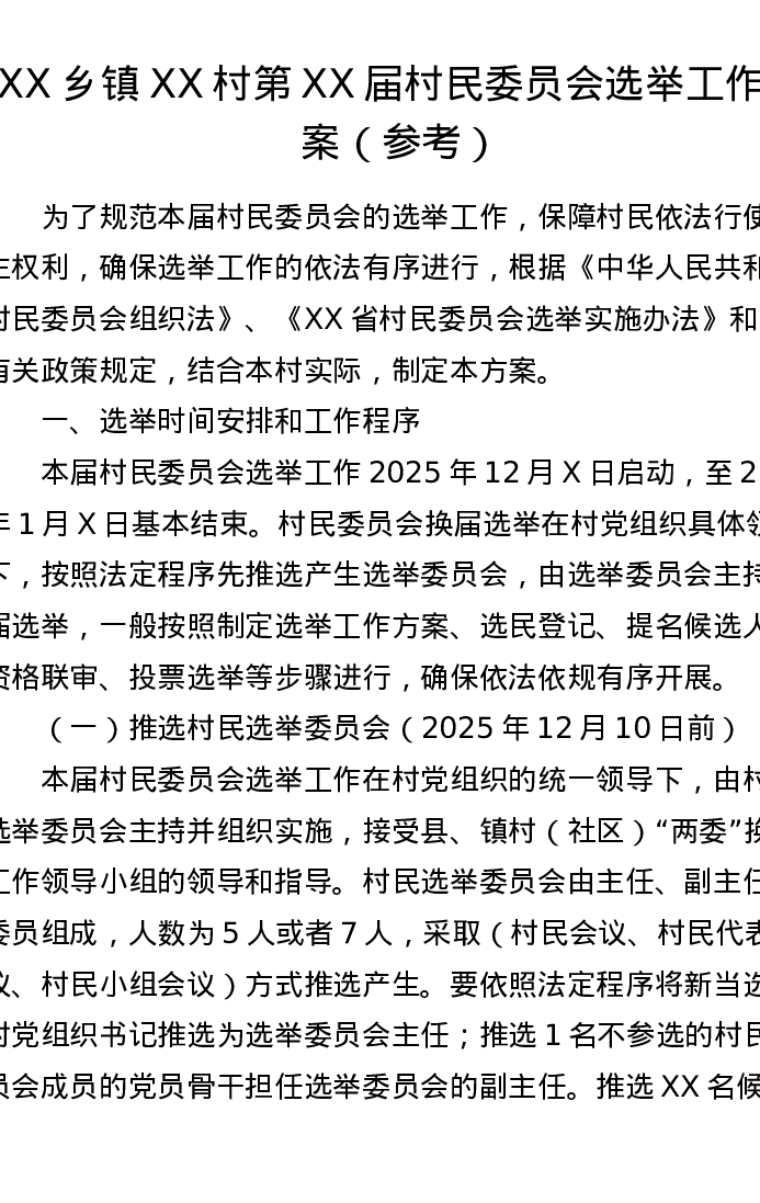 XX乡镇XX村第XX届村民委员会选举工作方案(参考)