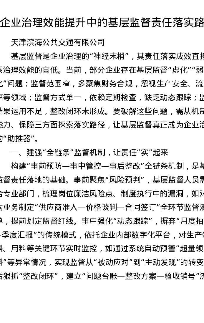 调研报告:企业治理效能提升中的基层监督责任落实路径