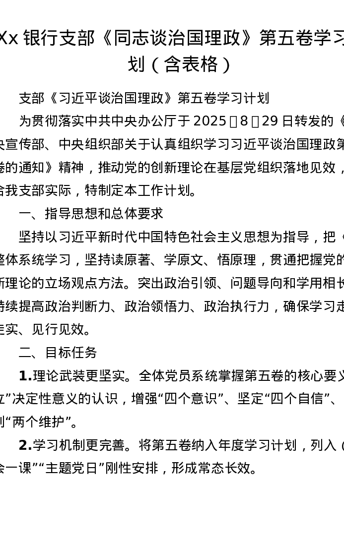 Xx银行支部《习近平谈治国理政》第五卷学习计划(含表格)