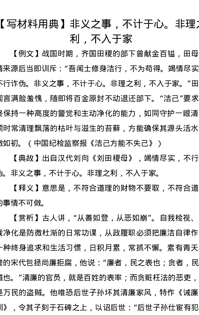 【写材料用典】非义之事,不计于心。非理之利,不入于家