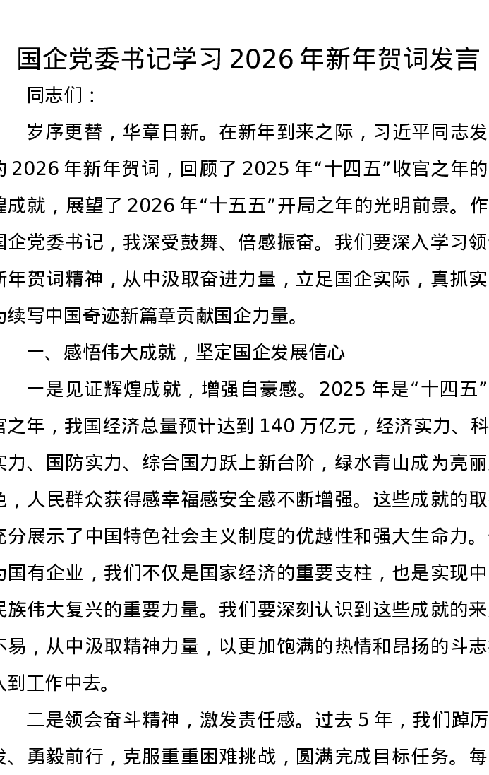国企党委书记学习2026年新年贺词发言