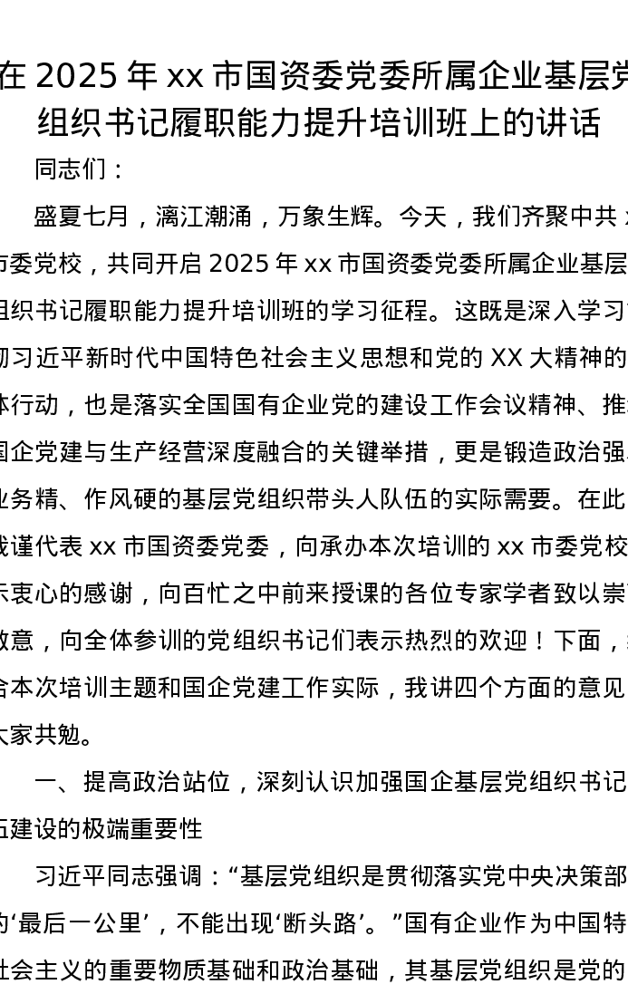 在2025年xx市国资委党委所属企业基层党组织书记履职能力提升培训班上的讲话