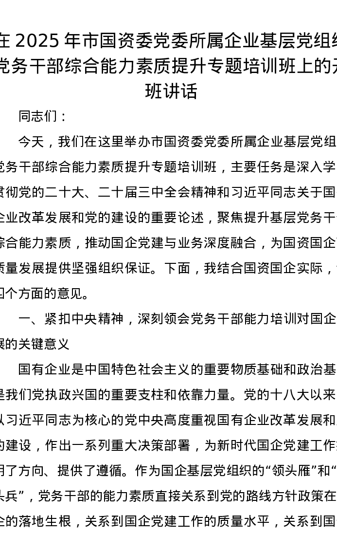 在2025年市国资委党委所属企业基层党组织党务干部综合能力素质提升专题培训班上的开班讲话