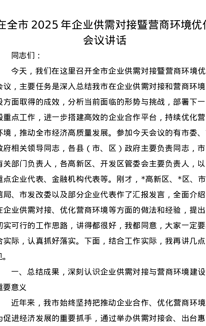 在全市2025年企业供需对接暨营商环境优化会议讲话