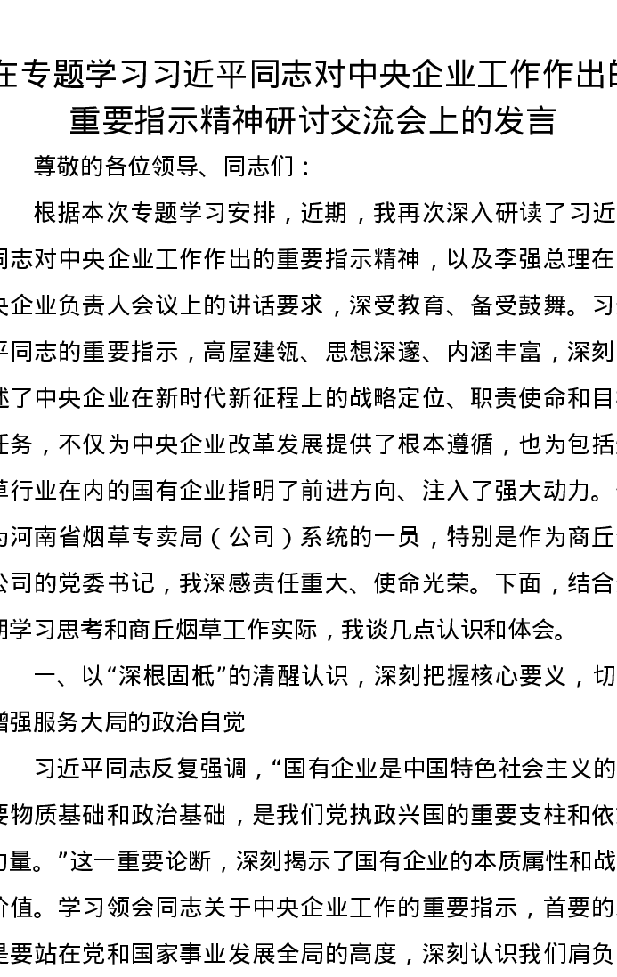 在专题学习习近平总书记对中央企业工作作出的重要指示精神研讨交流会上的发言