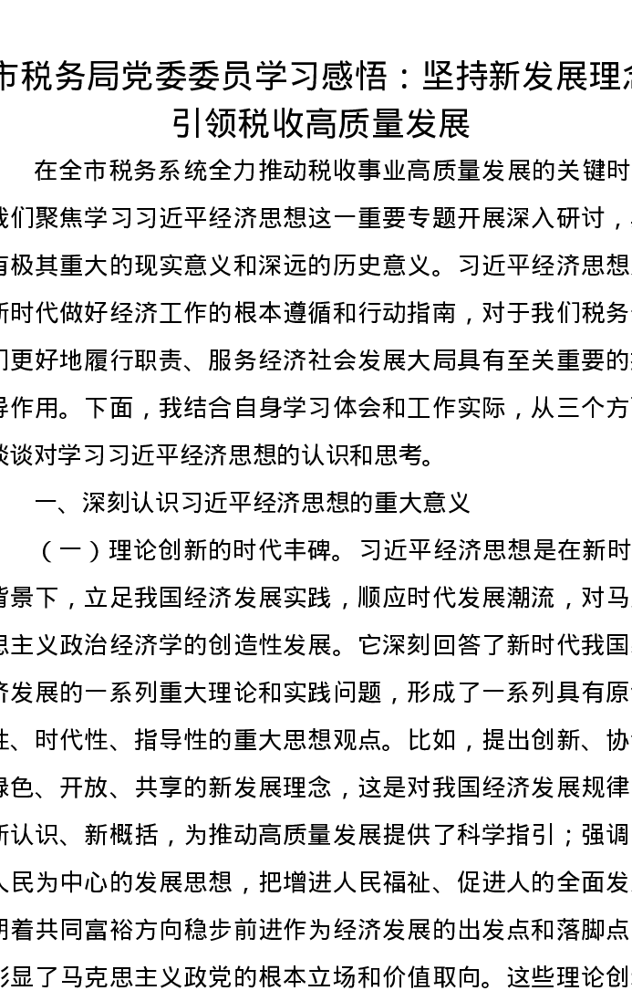 市税务局党委委员学习心得感悟:坚持新发展理念引领税收高质量发展