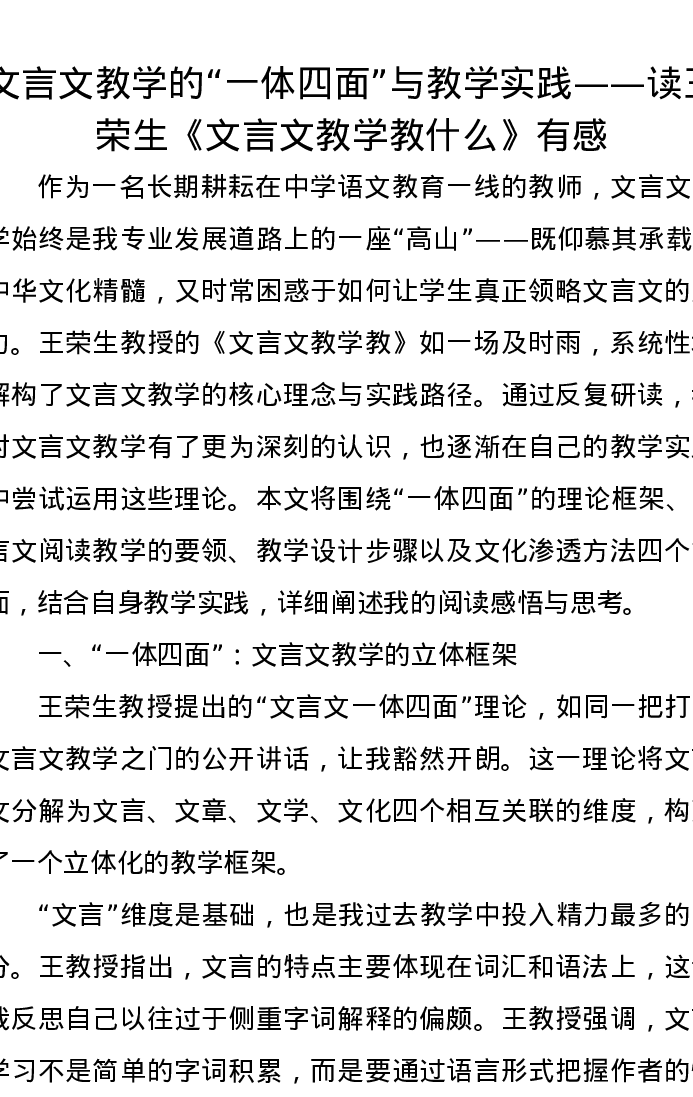 文言文教学的一体四面与教学实践——读王荣生《文言文教学教什么》心得有感