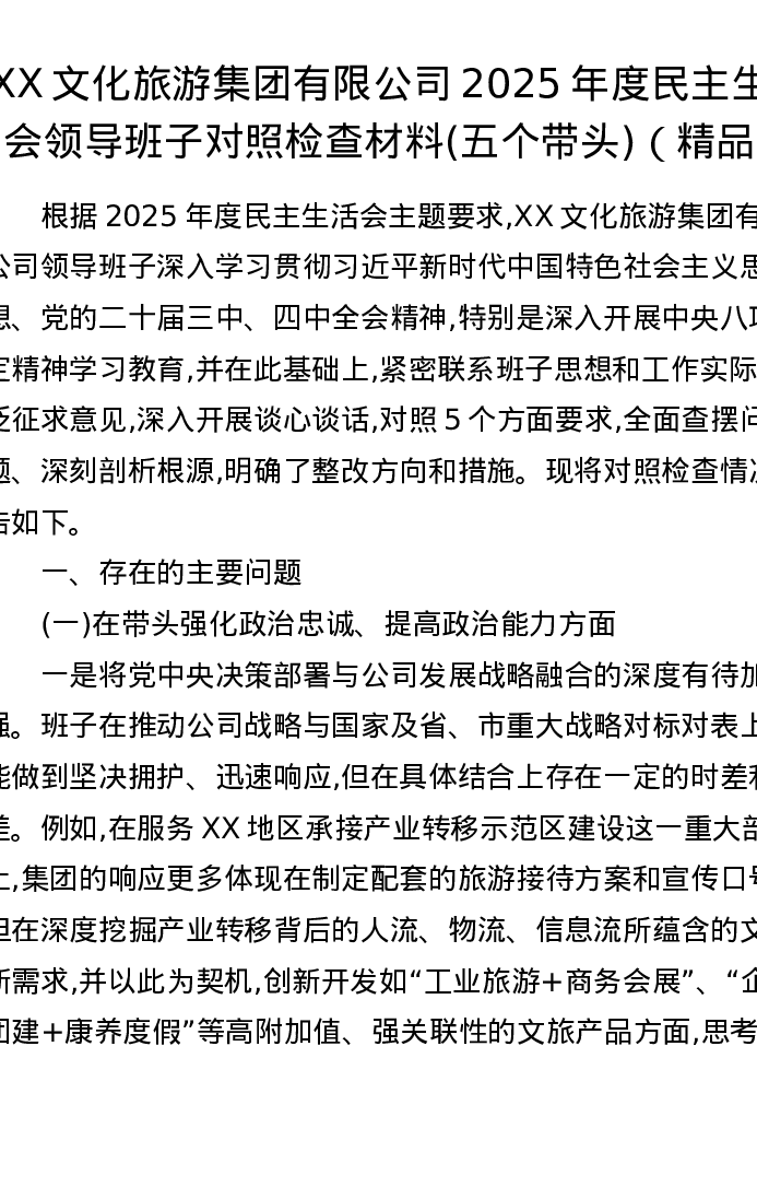 XX文化旅游集团有限公司2025年度xxxxx领导班子对照检查材料(五个带头)
