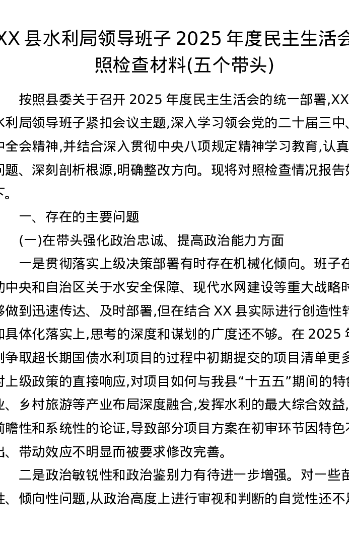 XX县水利局领导班子2025年度xxxxx对照检查材料(五个带头)