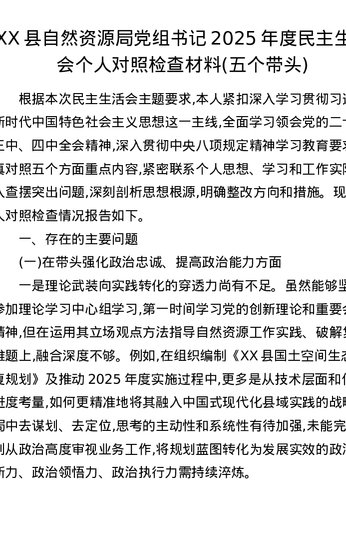 XX县自然资源局党组书记2025年度xxxxx个人对照检查材料(五个带头)