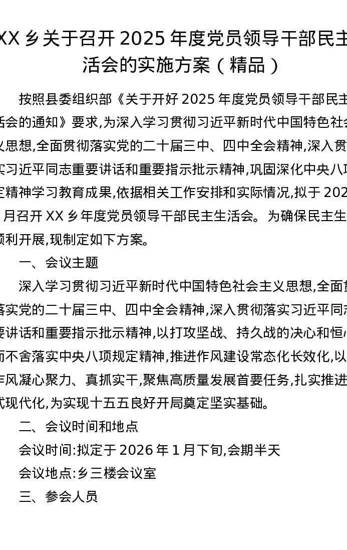 XX乡关于召开2025年度党员领导干部xxxxx的实施方案(五个带头)