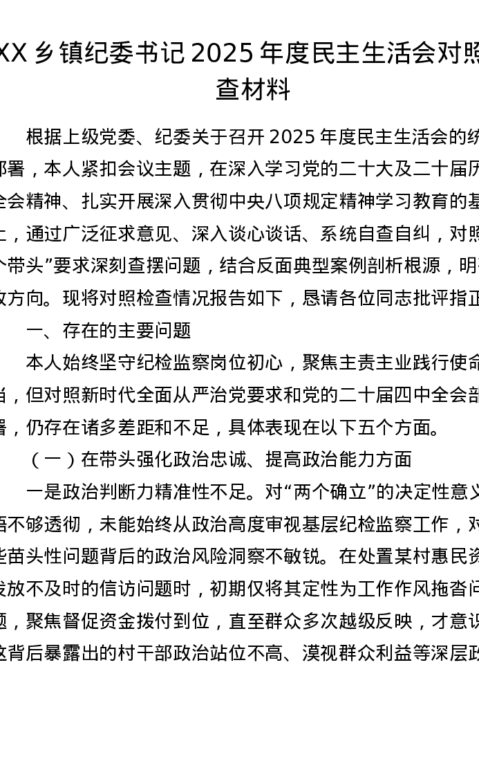 XX乡镇纪委书记2025年度xxxxx对照检查材料(五个带头)