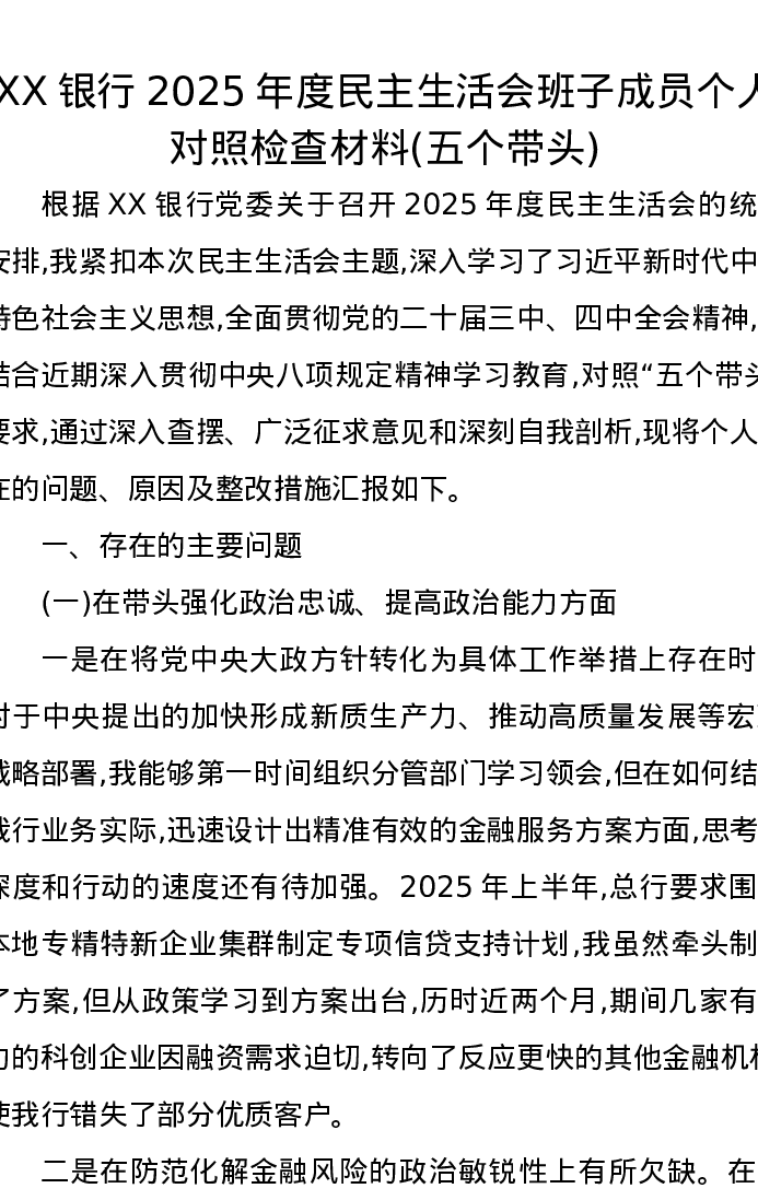 XX银行2025年度xxxxx班子成员个人对照检查材料(五个带头)